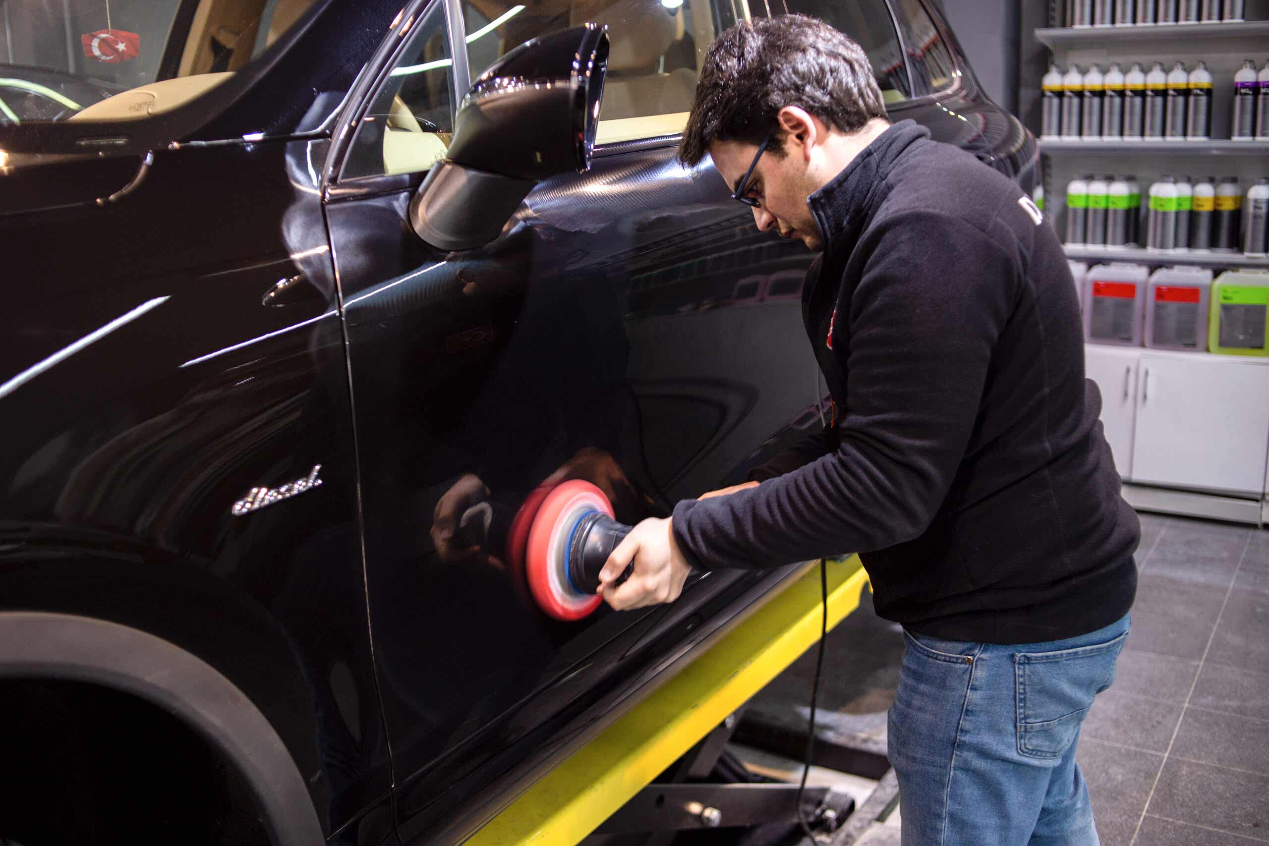 Aracınızın boyalı yüzeylerini kil ile temizledikten sonra boya üzerinde kalıntı kalmadığından emin oluruz. Polisaj aşamasında plastik parçalara zarar gelmemesi için maskeleme işlemine başlarız. Aracınızın boyasını detaylı olarak inceledikten sonra, gerekli ped ve ürün kombinasyonlarını belirleyip uygulamaya başlarız. Bu aşamada ilk önceliğimiz yüzeydeki çizikleri ve matlığı gidermektir. Düzgün bir yüzey elde ettiğimizde parlatma ve yüzeydeki polisaj kusurlarını gidermek için daha ince aşındırmalar yaparız. Bu esnada makina parkurumuzdaki farklı ekipman ve pedlerden faydalanarak, minimum aşındırma ile maksimum parlaklık elde etmeyi amaçlarız.